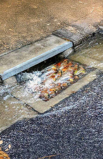 Urgent unblocking of stormwater pits and grated inlets clogged with leaves, sediment, or debris during storms to prevent backflow and flooding.